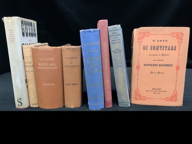 GASTRONOMIA. Lotto di 8 libri di gastronomia tra cui: Il liquorista. Milano:Hoepli, 1921 e CRAVIERI. Coltivazione delle piante aromatiche da distilleria. Milano: Hoepli, 1928. Non collazionato e difetti da esaminare.