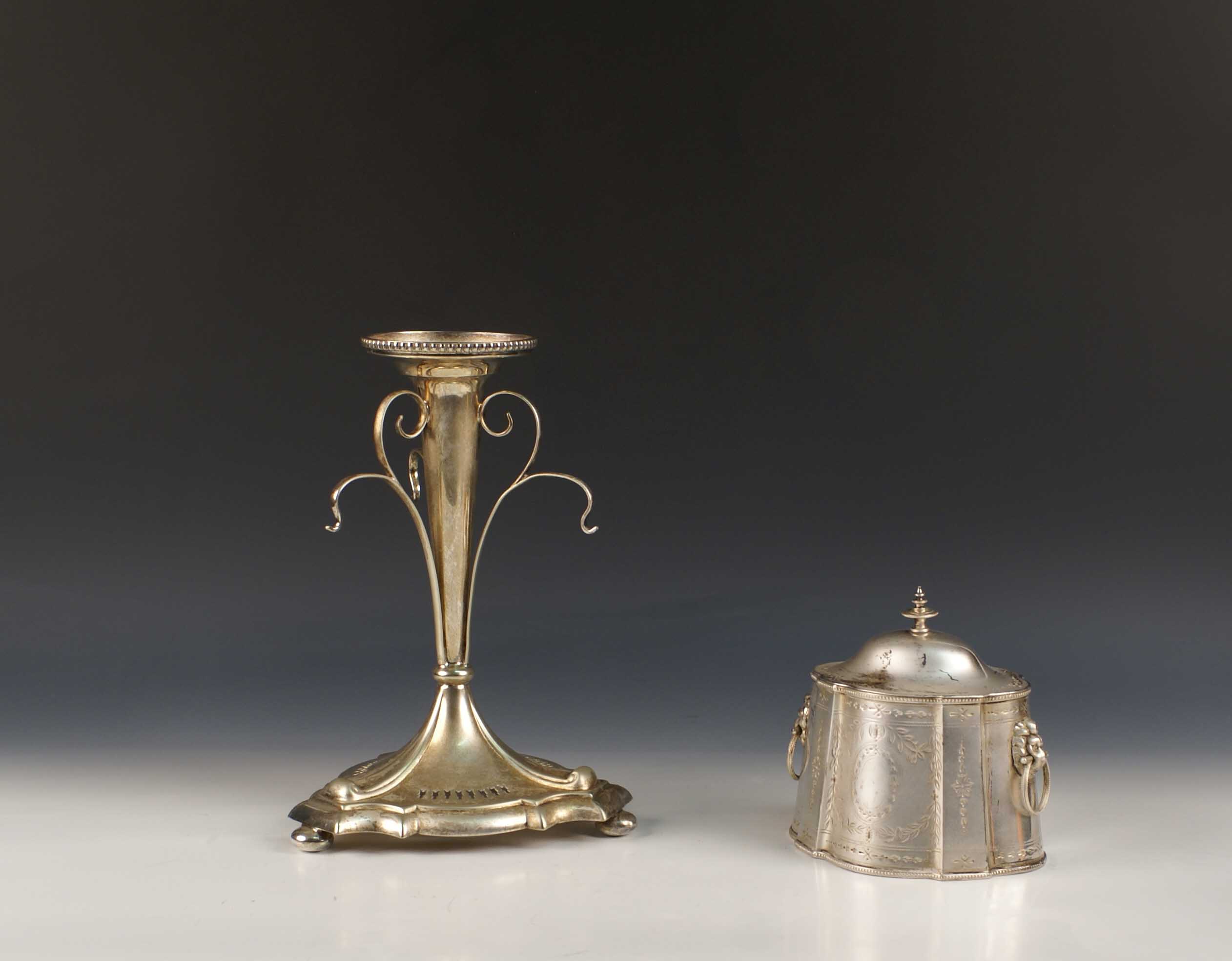 LOTTO IN METALLO ARGENTATO manifattura inglese Composta da una scatola porta the e un vaso porta bouquet