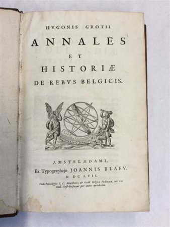 GROZIO, Ugo. Annales et Historiae de rebus belgicis. Amsterdam: Giovanni Blaeu, 1657. Vol. in 4to, con ritratto dell'autore, lettere xilografiche (saltuarie bruniture). Legatura in piena pelle, taglio marmorizzato (lievi difetti). Non collazionato e difetti da esaminare.