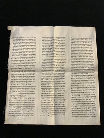 [JUDAICA]. Antico frammento di Torah su pergamena manoscritta in ebraico. Testo su tre colonne con parte della Genesi.