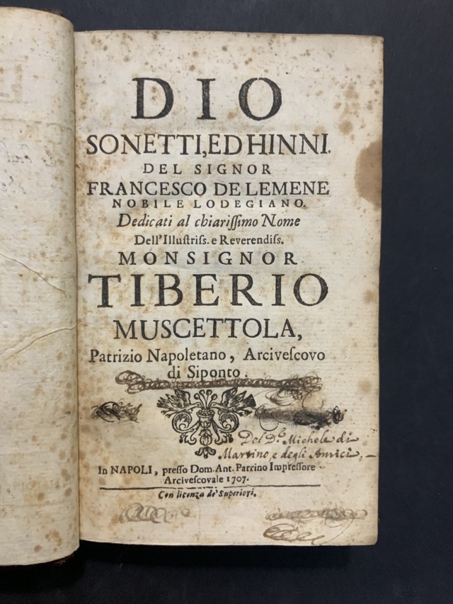 [LEGATURA] DELEMENE Francesco. Dio sonetti ed Hinni. Napoli: Parrino, 1707. 8vo, legatura coeva in vitello riccamente decorata in oro alle armi, titolo in oro al dorso. Bella legatura alle armi dell'Arcivescovo Francesco Maria Muscettola (1666-1746). Non collazionato e difetti da esaminare.