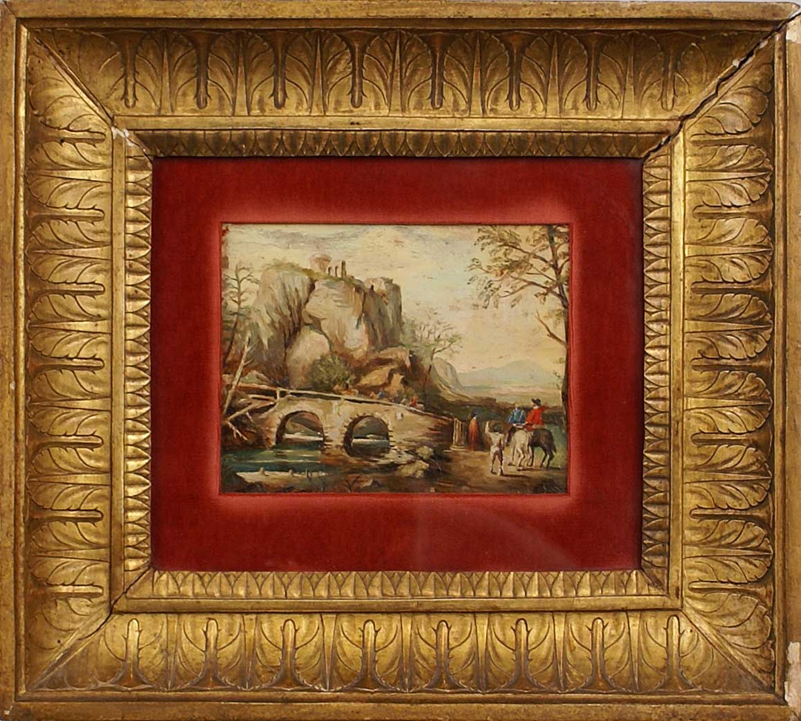 SCUOLA ITALIANA XX Sec. "Paesaggio con figure", olio su faesite, entro cornice antica in legno dorato Dim. 12,5x16,5 cm.