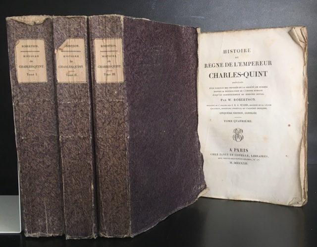 ROBERTSON, William. L'histoire du regne de l'empereur Charles-Quint, precedee d'un tableau des progres de la societe en Europe. Parigi: Janet e Cotelle, 1822. 4 volumi, 8vo. Brossura originale. Non collazionato e difetti da esaminare.