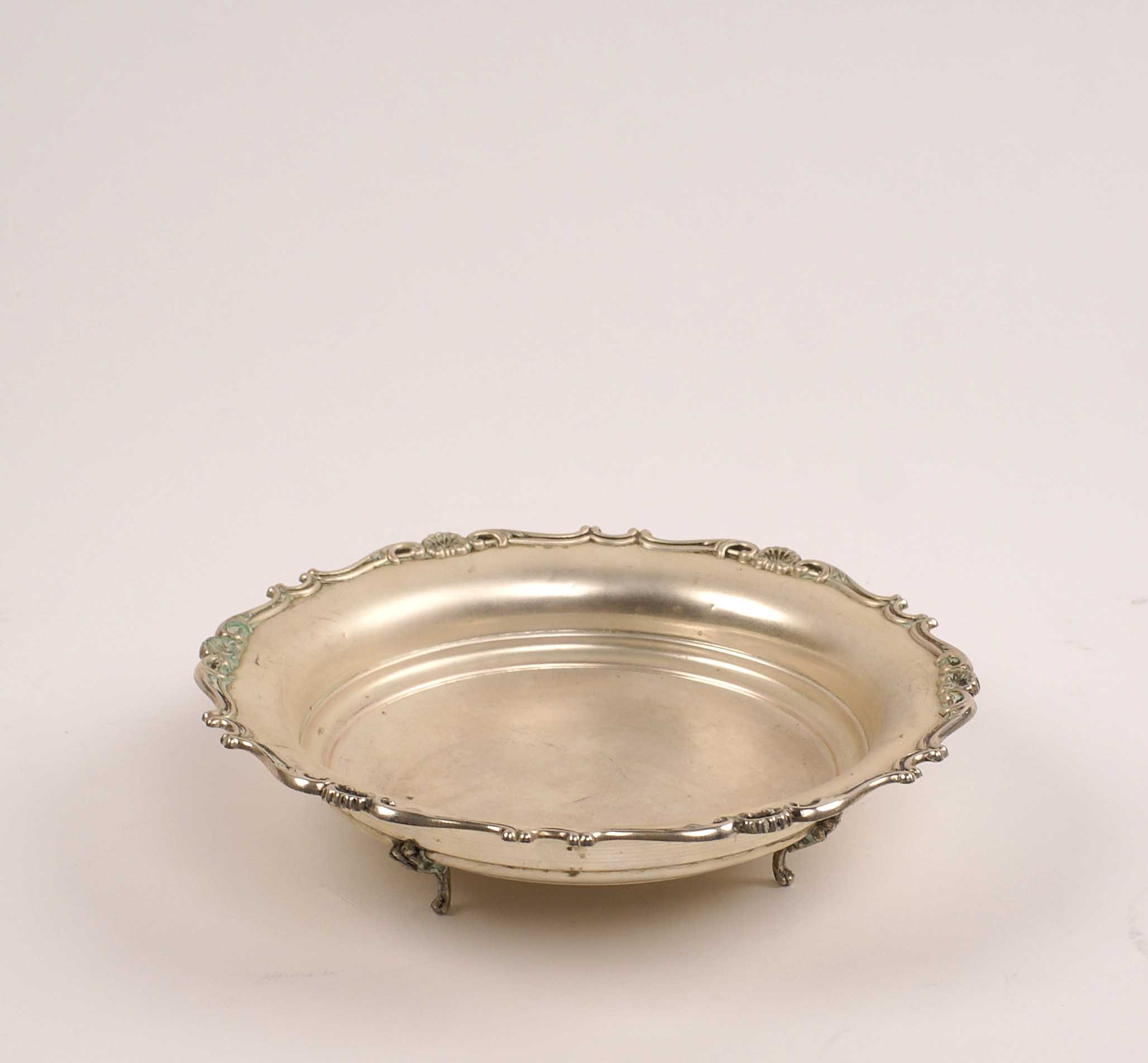 CENTROTAVOLA IN ARGENTO vecchia manifattura Con profilo smerlato, poggiante su tre piedini, d. cm. 24 Peso 313 gr.