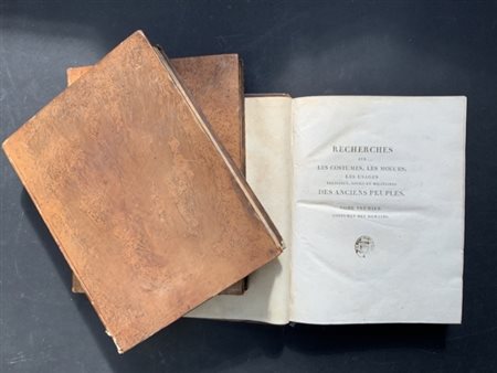 MALLIOT J. Recherches sur les costumes, les moeurs les usages religieux, civilis et militaires des anciens peuples. Parigi: didot l'aine, 1804-1809. 3 vol 4to, numerose tavole. Legatura coeva in piena pelle con titolo in oro su tasselli al dorso. Non collazionato e difetti da esaminare.
