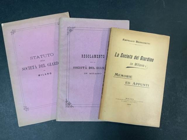 [MILANO - SOCIETA' DEL GIARDINO] piccolo nucleo dedicato al celebre club meneghino: statuto della società del giardino Milano: Rechiedei, 1882; Regolamento per la società del giardino, Milano: Ripamoonti Carpano, 1870; BRUSCHETTI Ampelio. La società del giardino in Milano memorie ed appunti. Milano: Zanaboni e Gabuzzi, 1899. Non collazionato e difetti da esaminare.
