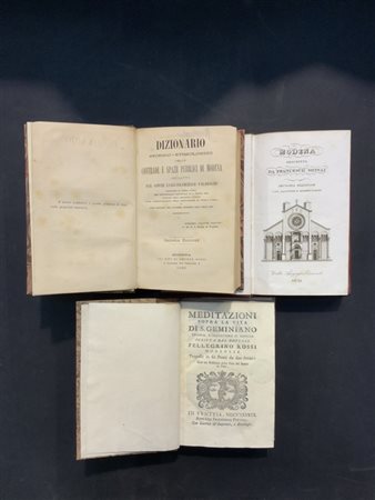 [MODENA - ARTE] Bel Lotto di 3 libri sui monumenti di modena: SOSSAJ, Francesco. Modena descritta. Modena, Tipografia Camerale, 1841. In 8. Frontespizio inciso con veduta della facciata della Cattedrale, in fine una tavola litografica ripiegata con la pianta di Modena. Legatura del XX secolo in pelle rossa con decori in oro; VALDRIGHI L. Francesco. Dizionario storico-etimologico delle contrade e spazi pubblici di Modena. Modena: Rossi, 1880. 8vo, qualche illustrazione e tabelle ripiegate. Legatura del XX secolo con dorso in pelle; ROSSI, Pellegrino. meditazioni sopra la vita di S. Geminiano. Venezia: Pitteri, 1738. 8vo, 4 tavole ripiegate. Legatura del xx secolo con dorso in pelle. Non collazionato e difetti da esaminare.