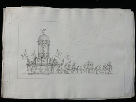 Modena, Eredi Soliani Tipografi Reali, 1842. In folio oblungo entro bel cofanetto moderno, brossura editoriale preservata (con difetti). Tre carte introduttive (frontespizio, dedica e Premessa) e 13 tavole incise raffiguranti i carri della città di Modena e dei comuni limitrofi (Carpi, Vignola, etc.), precedute da altrettante carte con la spiegazione dei carri. Non collazionato e difetti da esaminare.