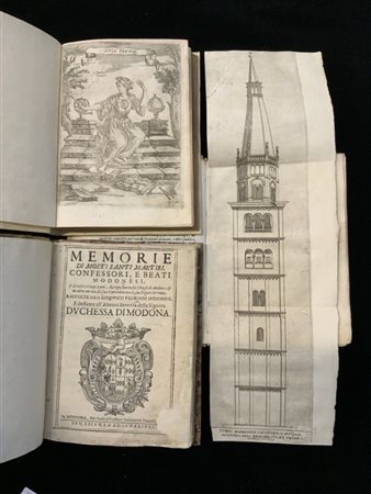 [MODENA] - VEDRIANI, Lodovico. Raccolta de'pittori, scultori, et architetti modonesi più celebri. Modena: Soliani stampatore ducale, 1662. 4to piccolo, 2 tavole ripiegate (quella della torre della cattedrale e quella del lato della cattedrale). Pergamena coeva. NEL LOTTO ANCHE le Memorie di molti Santi e Martiri Confessori, e Beati Modonesi. Modena: Andrea Cassiani stampatore ducale, [s.d.] con numerose incisioni in rame di ottima qualità. INSIEME A: Vedriani, Lodovico. Dottori modonesi di teologia, filosofia, legge canonica, e civile, con i suoi ritratti dal naturale in rame. Modena: 1665. Non collazionato e difetti da esaminare.