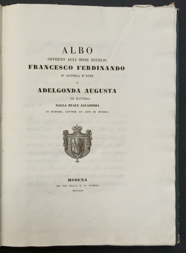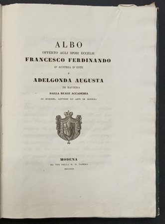 [MODENA] Albo Offerto Agli Sposi Eccelsi Francesco Ferdinando D'Austria D'Este E Adelgonda Augusta Di Baviera. Modena: R.D.Camera, 1842. Folio, legatura in marocchino verde alle armi estensi incorniciata da una cornice dorata. Non collazionato e difetti da esaminare.