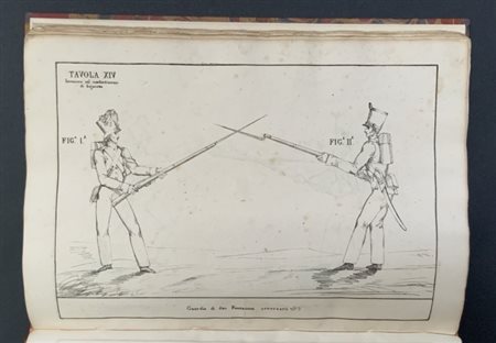 [MODENA] Atlante di 82 tavole che servono ai diversi regolamenti pei reali ducali cacciatori estensi. Modena: Gaddi, 1833. Folio, frontespizio inciso, 82 tavole fuori testo. Bel manuale militare che illustra manovre, divise e le marce del corpo dei cacciatori. Non collazionato e difetti da esaminare.