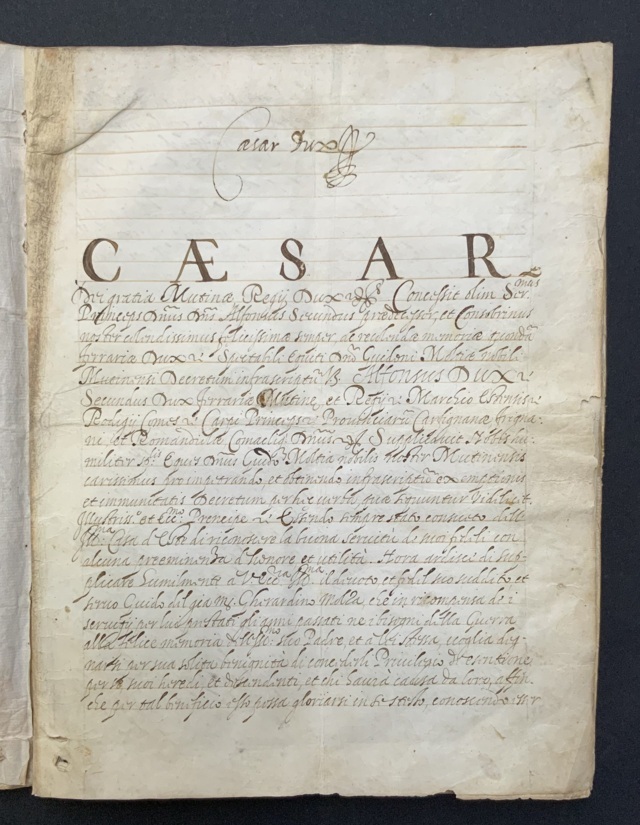 [MODENA] Manoscritto pergamenaceo contenente i privilegi concessi ai marchesi Molza dai d'Este, duchi di Modena e reggio. Il primo è concesso da Cesare d'Este, seguito da Francesco I, Alfonso IV, Laura Martinozzi e Francesco III. Tutti riportano le firme autografe e resti di sigilli in ceralacca. Legatura coeva in pergamena floscia. Non collazionato e difetti da esaminare.