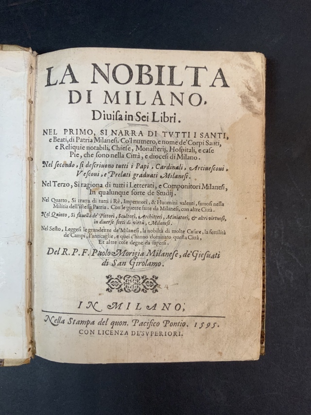 MORIGIA PAOLO. La nobiltà di Milano. Milano: Pontio, 1595. I4to, ritratto dell'
