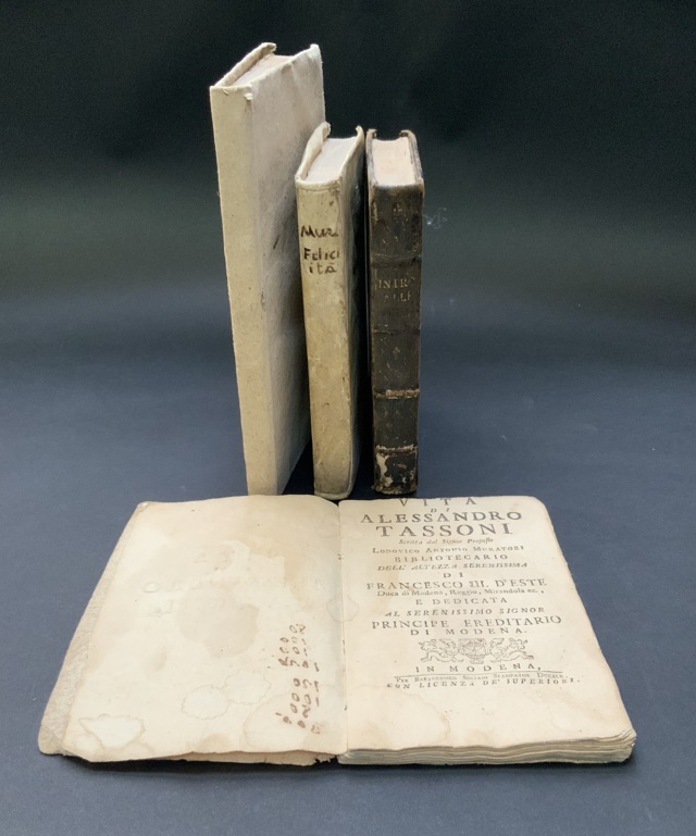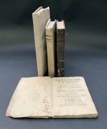MURATORI Ludovico. Lotto di 3 opere: Della Pubblica felicità. Lucca, 1749. 8vo, legatura in pergamena; Vita di Alessandro Tassoni. Modena: Soliani, 1739. 8vo, Ritratto di tassoni, capilettera figurati. brossura coeva; Introduzioni alle paci private. Modena: Soliani, 1708. Legatura coeva in piena pelle; Vita del conte Fulvio Testi. Modena: Società tipografica, 1780. 8vo, brossura coeva. Non collazionato e difetti da esaminare.