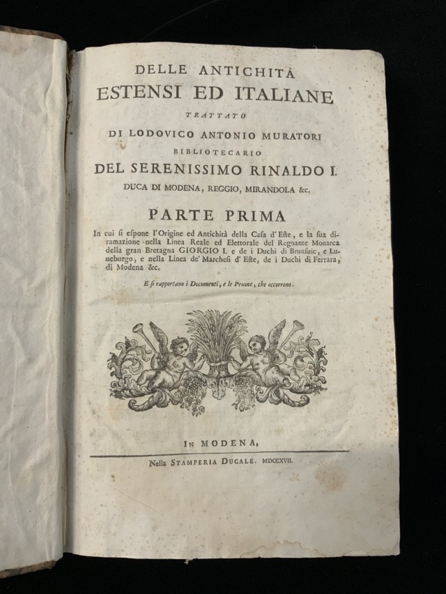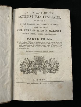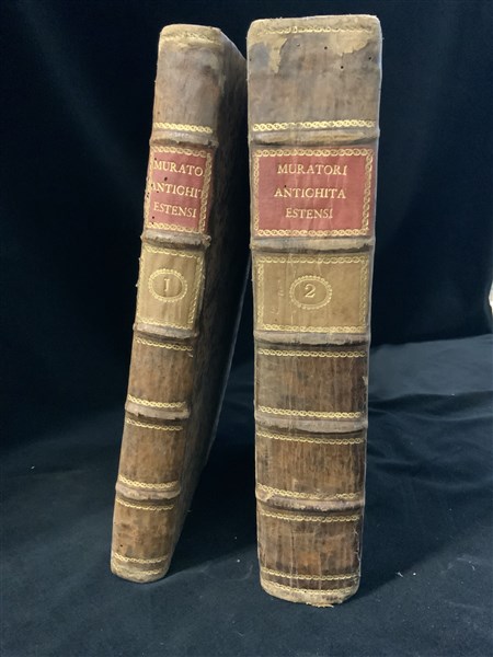 MURATORI, Lodovico Antonio (1672-1750). Delle antichità estensi ed italiane. 1717-1740. Modena: Stamperia Ducale, 1717-1740. 2 volumi in belle legature coeve con dorso in pelle su piatti marmorizzati e con tagli a spruzzo rossi. Non collazionato e difetti da esaminare.