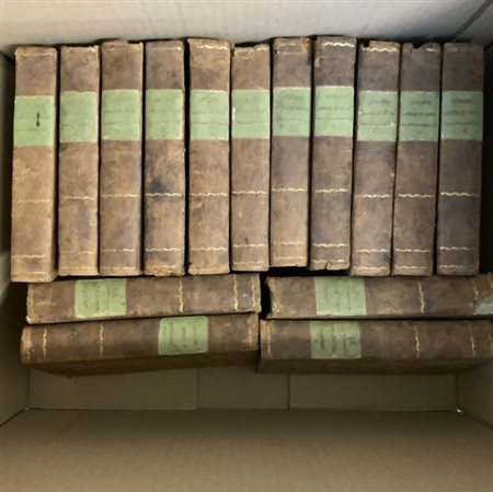 MURATORI, Lodovico Antonio. Annali d'Italia dal principio dell'era volgare sino all'anno MDCCXLIX. Milano: Giambattista Pasquali, 1753-1756. 15 volumi così suddivisi: voll. 2-10, 12-16 e volume di indice, in 8vo, dorsi in pelle coeva, piatti in cartone marmorizzato e tagli a spruzzo rossi. Non collazionato e difetti da esaminare.
