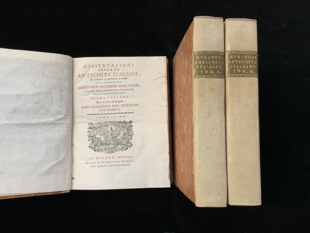 MURATORI, Lodovico Antonio. Dissertazioni sopra le antichità italiane. Milano: Giambattista Pasquali, 1751. 3 volumi in 4to, ottima copia, frontespizio in rosso e nero, antiporta incisa in rame al primo volume e vignette xilografiche ai frontespizi. Dorso in pergamena coeva su piatti in carta marmorizzata, vivaci tagli rossi. Non collazionato e difetti da esaminare.