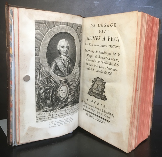 PAPACINO D'ANTONI A. De l'usage des armes a feu. Parigi: Lambert, 1785. 8vo, ritratto in antiporta, 6 tavole ripiegate e alcune tabelle. Legatura in piena pelle con titolo e decori in oro al dorso, tagli rossi. Bel trattato figurato sull'Artiglieria di D'Antoni, grande maestro di artiglieria del Regno di Sardegna e direttore della scuola di Artiglieria. Non collazionato e difetti da esaminare.