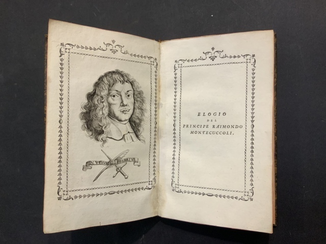 PARADISI, Agostino. Elogio del principe Raimondo Montecuccoli. Bologna: Lelio dalla Volpe, 1776. 8vo, ritratto in antiporta, testo entro cornice xilografica. Legatura in piena pelle con cornici impresse in oro ai piatti. Non collazionato e difetti da esaminare.