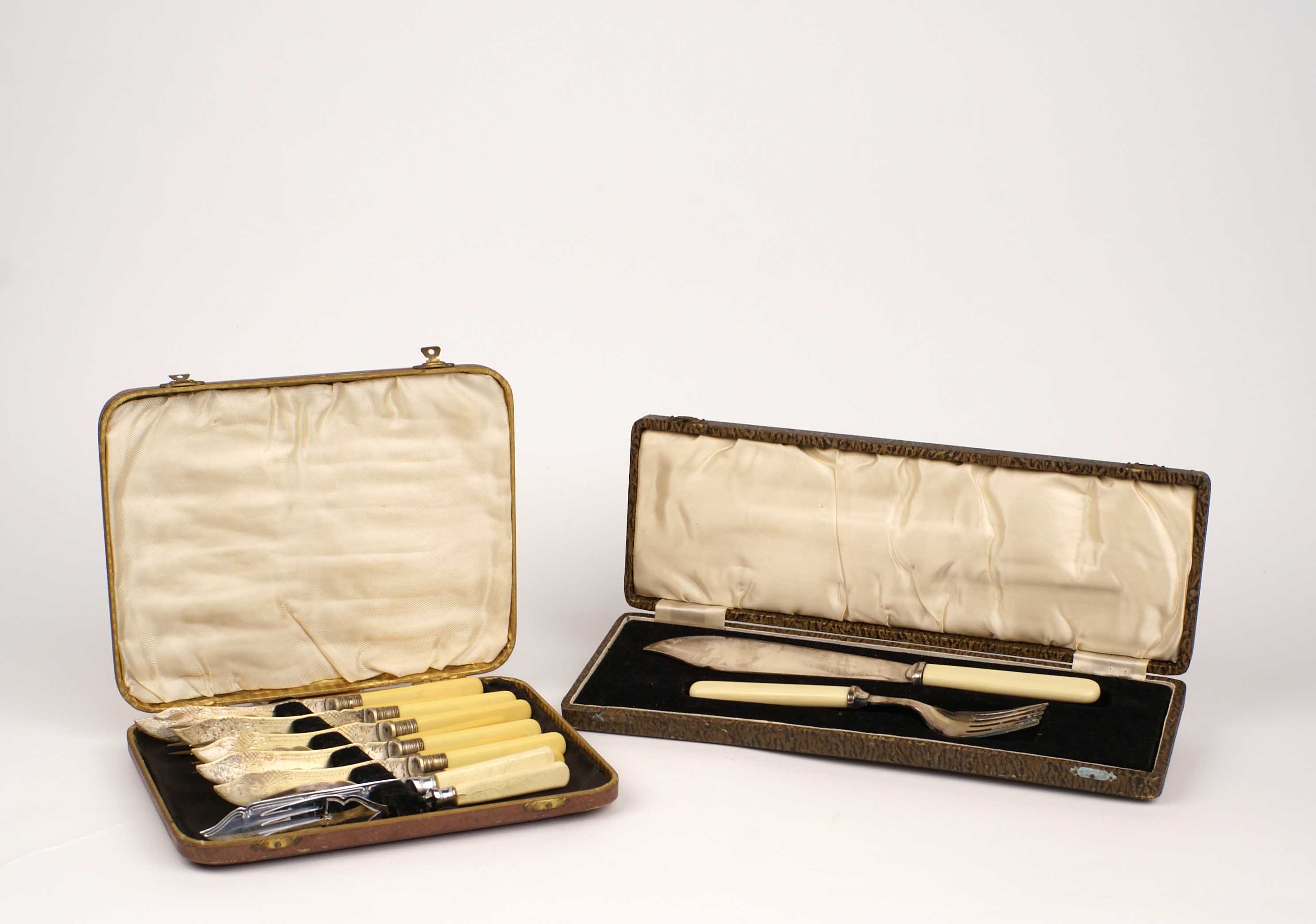 LOTTO DI POSATE IN SHEFFIELD Inghilterra primi '900 Composto da sei forchette, sei coltelli da pesce e una coppia di posate da portata da pesce, entro astucci