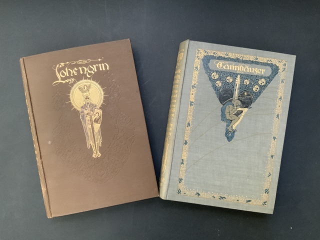 POGANY, Willy; WAGNER, Richard. Tannhauser. Londra: G. G. Harrap, 1911 [CON] Lohengrin. Londra, G.G. Harrap & Co, 1911. 2 voll, 4to, tavole a colori e illustrazioni nel testo, brossure coeve riccamente decorate. Due volumi riccamente illustrati della trilogia wagneriana illustrata da Pogany, noto artista ungherese specializzato in illustrazioni di gusto Art Decò. Non collazionato e difetti da esaminare.