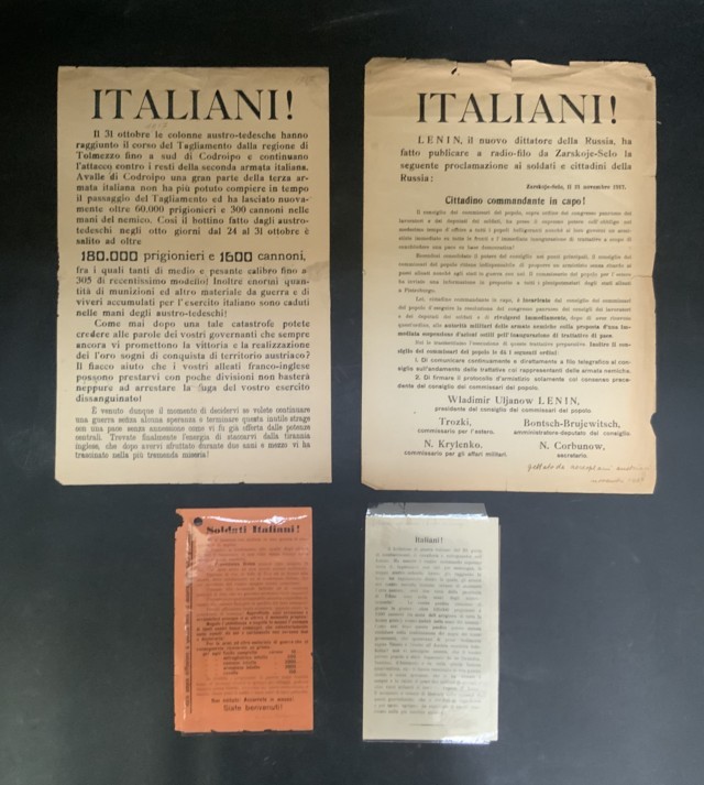 [PRIMA GUERRA MONDIALE - MANIFESTI AUSTRIACI] Lotto di 4 manifesti austriaci del primo conflitto mondiale destinati alla diffusione oltre le linee nemiche e gettati da aeroplani. Nel lotto: 1- Salvacondotto su carta arancione 2- "Italiani!" volantino del 21 Novembre 1917 che riporta la decisione di Lenin di ritirare la Russia dal conflitto 3- "Italiani!" volantino del 31 Ottobre che riporta le cifre delle perdite italiane durante la battaglia di Caporetto. 4- "Italiani!" volantino relativo a Caporetto