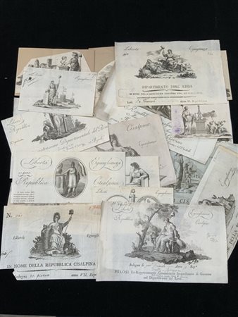 [REPUBBLICA CISALPINA] Numerosa raccolta di incisioni in rame tratte da editti e carte intestate tutte rappresentanti l'allegoria della Repubblica Cisalpina. Un bell'insieme che illustra l'iconografia del primo governo repubblicano della storia recente italiana