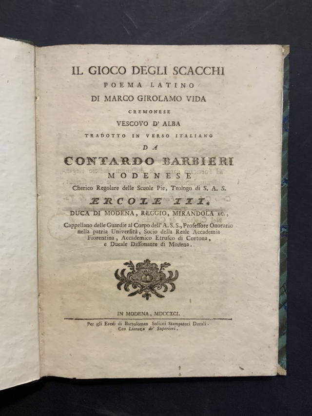 [SCHACCHI] VIDA Marco Girolamo. Il gioco degli scacchi. Modena: Solani, 1791. 8vo, legatura del XIX con dorso in pelle verde con titoli e decori in oro. Non collazionato e difetti da esaminare.