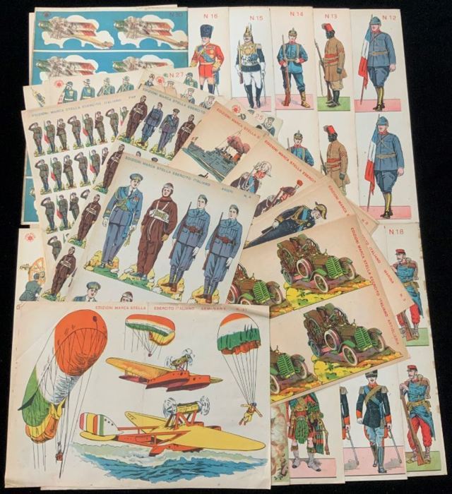 [SOLDATINI] Raccolta di foglietti a colori di figurine "Marca Stella" raffigura