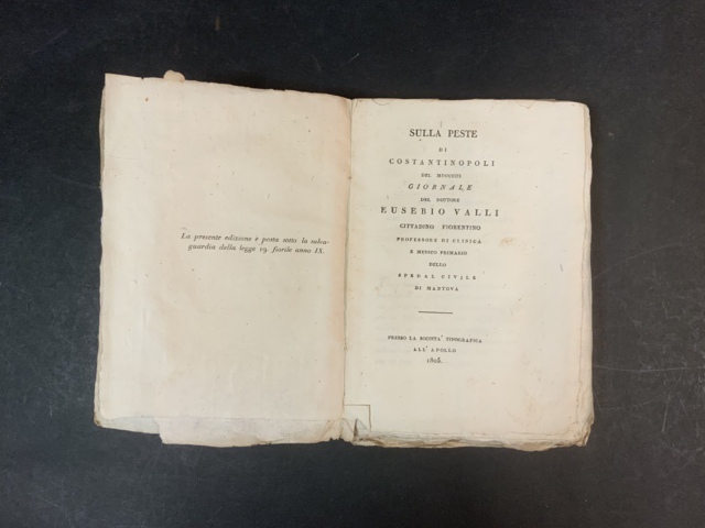 VALLI, Eusebio (1755-1816) - Sulla peste di Costantinopoli del MDCCCIII. [Mantova]: società tipografica all'Apollo, 1805. 8vo, carta azzurra coeva, in barbe (difetti al dorso). Collazionato e completo