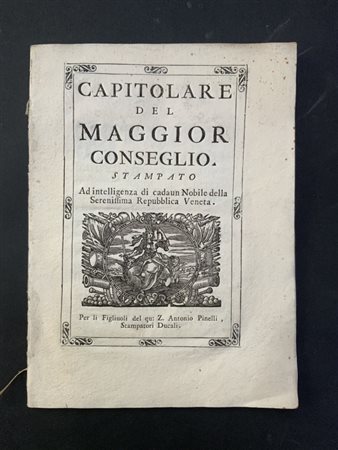 [VENEZIA] Capitolare del maggior consiglio. Venezia: Pinelli, [1668]. 4to, vignetta al frontespizio, testo entro bordura. Privo di legatura. Edizione a stampa del capitolare del Maggior Consiglio, la più alta istituzione del governo veneziano. Viene riportato il cerimoniale e le istruzioni da seguire per le votazioni e tutte le attività politiche. Non collazionato e difetti da esaminare.