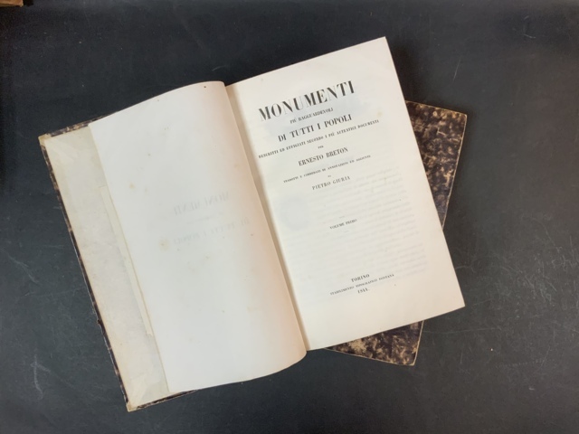 GIURIA, P. Monumenti più ragguardevoli di tutti i popoli. Torin: Fontana, 1844. 4to, 2 voll, numerose tavole protette da velina e illustrazioni nel testo. Legatura coeva con dorso in marocchino verde, titoli e decori in oro, buone condizioni interne. Non collazionato e difetti da esaminare.