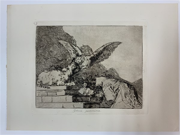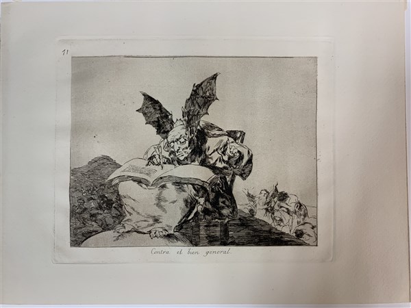 GOYA Y LUCIENTES, Francisco. Desastres de la guerra. Una serie di incisioni dalla celebre serie che includono "Contra el bien general". Incisione (173 x 214mm), carta (238 x 318mm) con il numero "71" in alto a sinistra; Gatesca pantomima. Incisione (174 x 214mm), carta (238 x 318mm) con il numero "43" in alto a sinitra; Que valor! Incisione (152 x 205mm), carta (232x 308mm) con il numero "7" in alto a sinistra; e Farándula de Charlatanes. Incisione (214 x 168mm), carta (234 x 318mm) con il numero 75 in alto a sinistra. (Alcune occasionali fioriture ai margini della carta che non toccano l'incisione). Non collazionato e difetti da esaminare.