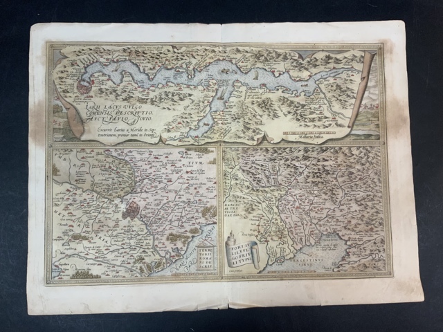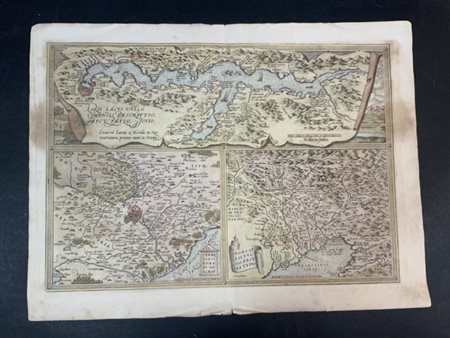 ORTELIUS, Abraham. Larii Lacus Vulgo Comensis Descriptio, Auct. Pavio Jovio... [nello stesso foglio] Territorii Romani Descrip. [e] Fori Iulii, Vulgo Friuli Typus. Edizione francese non datata (ca. 1570-1592). Non collazionato e difetti da esaminare.