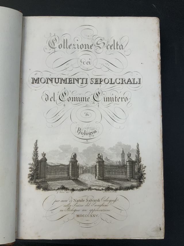 SALVARDI, Natale - Collezione scelta dei monumenti sepolcrali del comune cimitero di Bologna". Bologna: presso l'autore, 1825-1839. Folio (401 x 260mm). Frontespizio con vignetta di un cimitero su disegno di G. Ferri, dedica e 60 incisioni a piena pagina dei monumenti con biografia e tavola di epigrafi (fioriture). Dorso in pelle coeva, piatti in cartone rosso marmorizzato, in barbe. Non collazionato e difetti da esaminare.