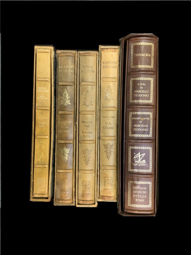 [EDITALIA] Cinque volumi in piena pelle editi da Editalia, Roma. Ciascun volume entro il suo cofanetto: "Venezia nell'Ottocento" 1975, es. 1009/1999; "Firenze nell'Ottocento" 1979, es. 568/2499 (alcune fioriture); "Roma nell'Ottocento" 1975, es. 778/1999; "Roma nel Quattrocento" 1982; es. 1311/2499