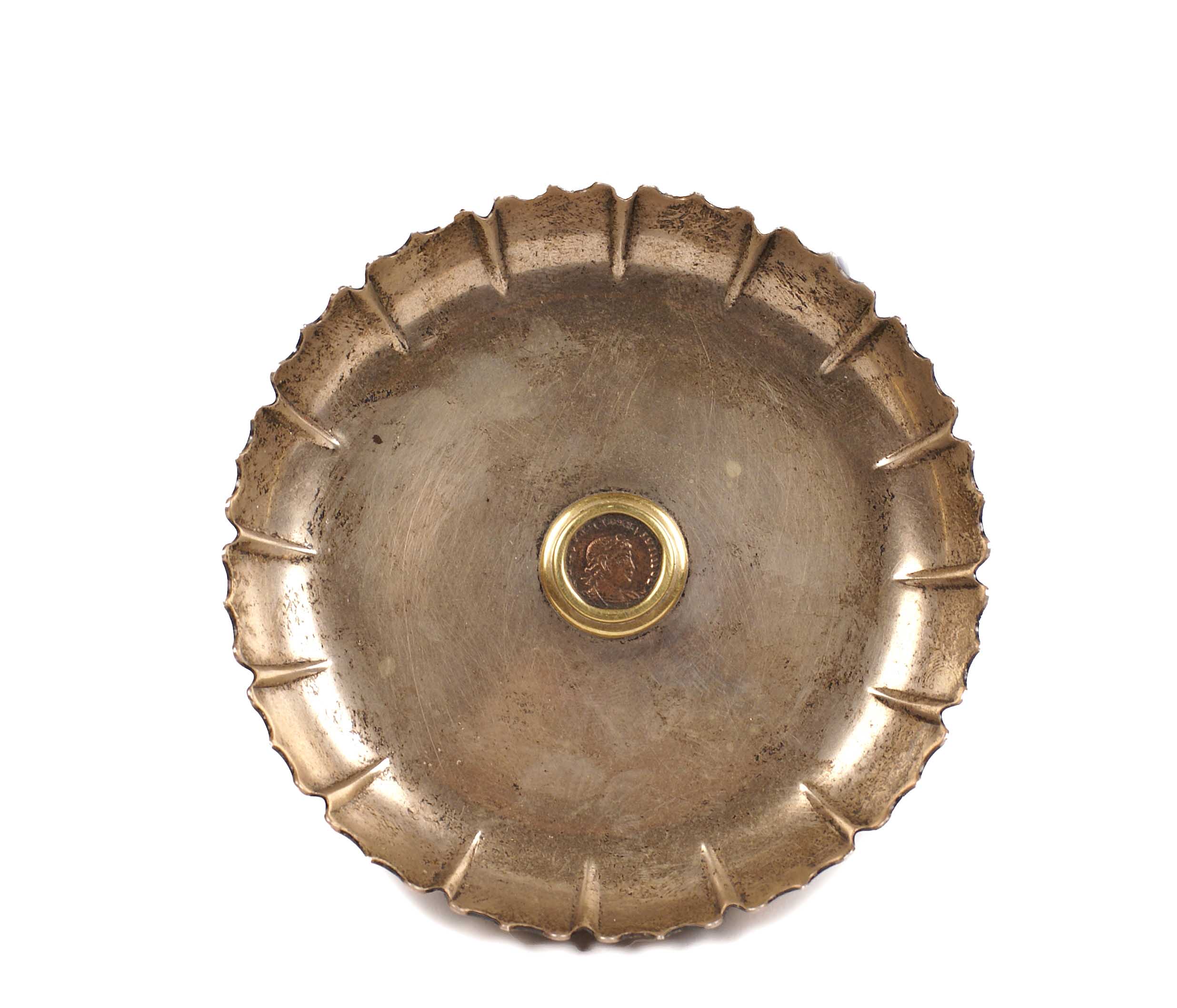PIATTINO BULGARI IN ARGENTO TITOLO 925 Italia vecchia manifattura Con al centro una moneta antica in bronzo, d. cm. 11,5 Peso 145 gr.
