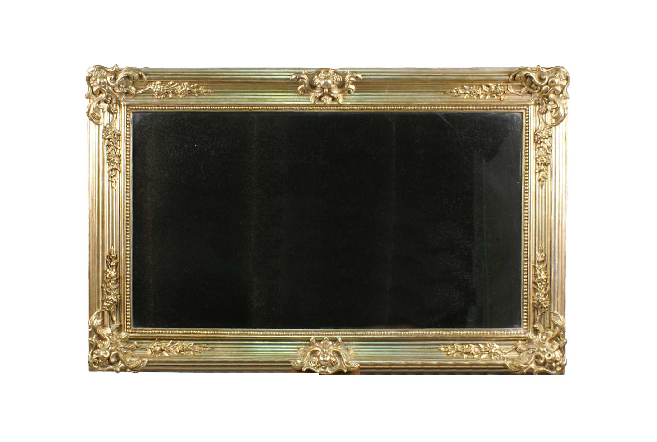 SPECCHIERA CON CORNICE IN LEGNO Di forma rettangolare dorato a mecca, intagliata e decorata a motivo floreale Dim. 65x100 cm.