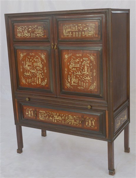Mobile bar a due ante, un cassetto e pianetto estraibile, intarsiato in avorio