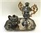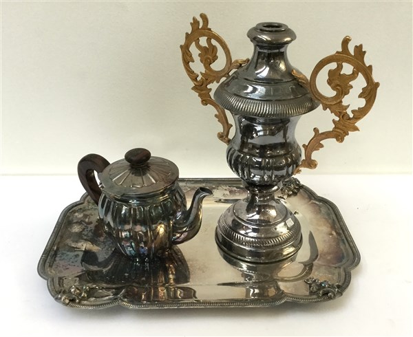Lotto composto da un vassoio, una teiera ed una coppa biansata in metallo agentato (difetti e mancanze)