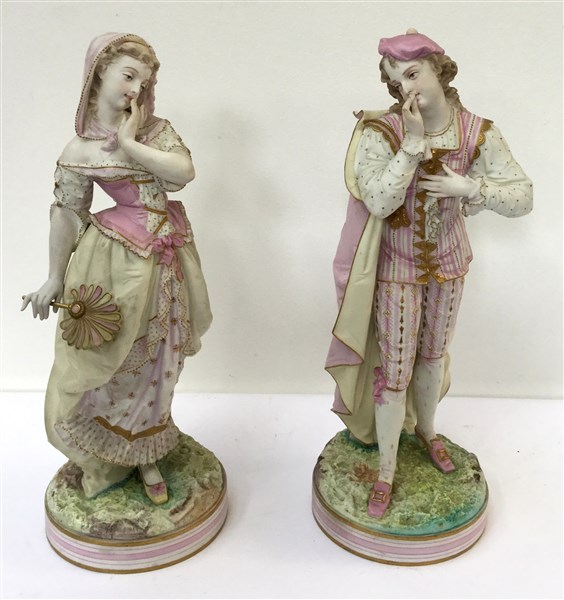 Coppia di scolture in bisquit raffiguranti una coppia di giovani in eleganti abiti settecenteschi. Marcate sul fondo con monogramma "MA" (h cm 45) (lievi difetti)