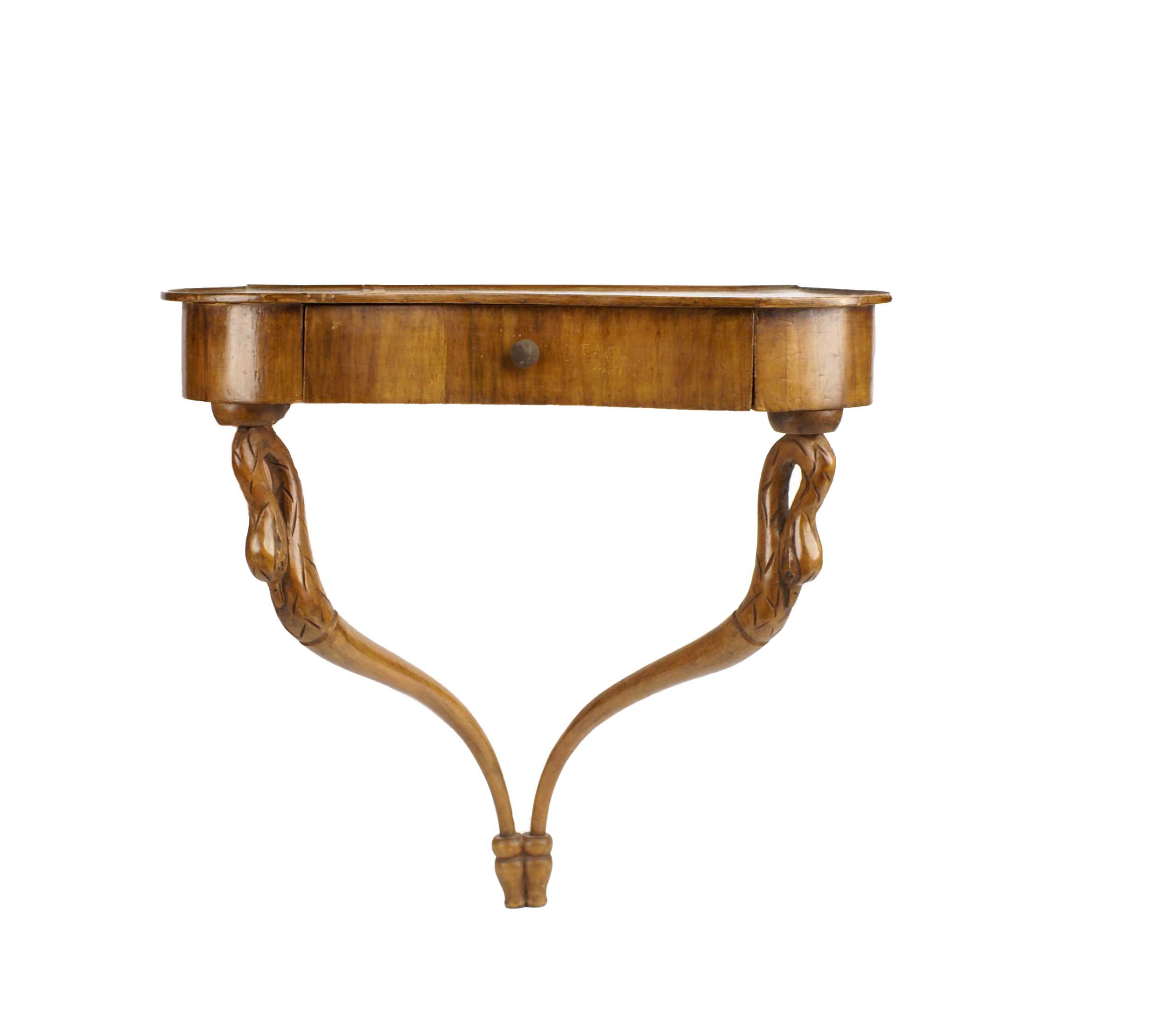 PICCOLA CONSOLE A GOCCIA IN NOCE vecchia manifattura Piano sagomato con un tiretto sottostante poggiante su due sostegni a motivo di cigni Dim. 50x52x29 cm.