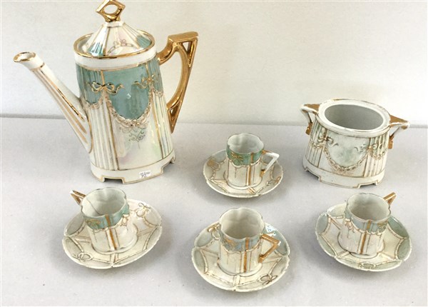 Parte di servizio da caffè "Liberty" in porcellana composto da caffettiera, zuccheriera, quattro tazzine con cinque piattini (difetti e mancanze)