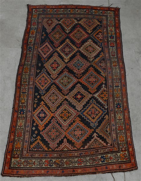 Decoro a medaglioni romboidali policromi su fondo blu notte (cm 227x120) (difetti e rapature)