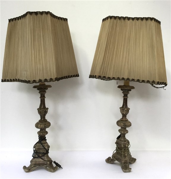 Lotto 1593 | Coppia di candelieri tripodi in legno dorati a mecca, montati a luce elettrica