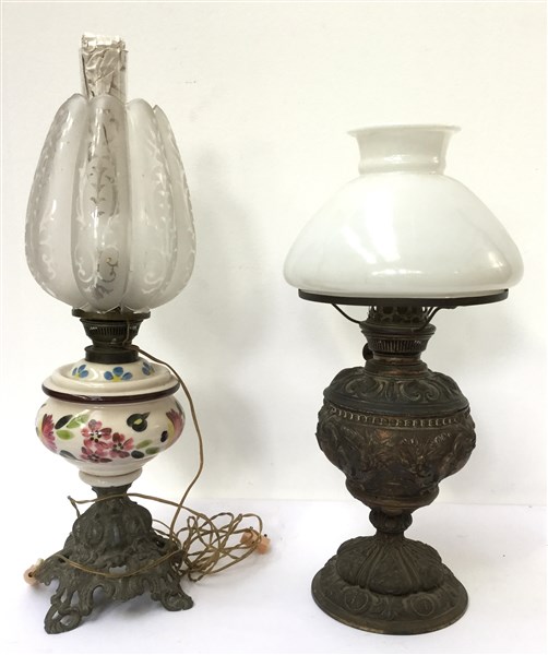 Lotto composto da due lampade ad olio diverse, di cui una montata a luce elettrica (difetti)