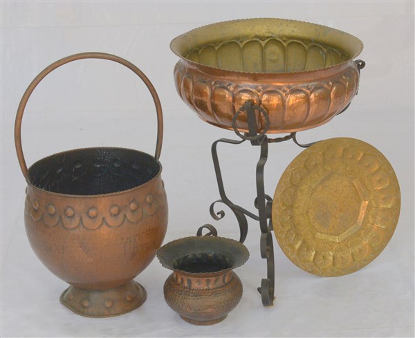 Lotto composto da un braciere, due contenitori e un piatto in rame e ferro battuto (difetti)