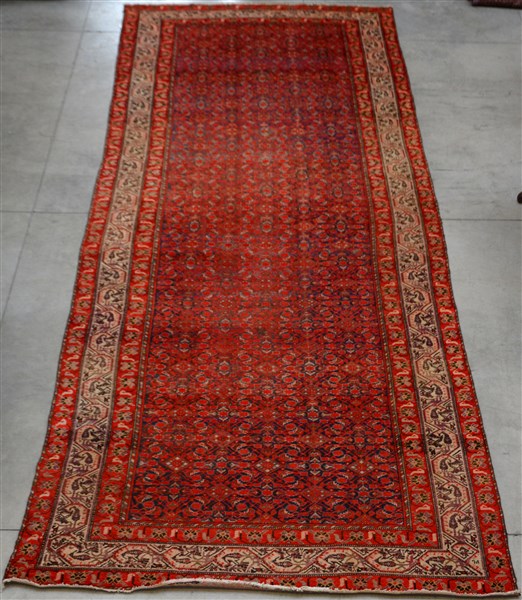 Tappeto Ferahkan, Persia inizio secolo XX. Disegno Herati nei toni del rosso e nocciola su fondo blu. Bordura princiapale a meandro con boteh su fondo bianco (cm 510x204) (difetti)