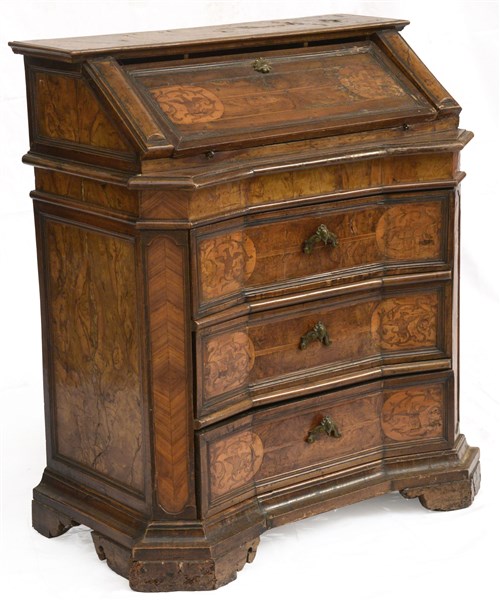 Ribaltina lastronata, filettata e intarsiata a motivi stilizzati. Anta ribaltabile celante cassettini, tre cassetti di linea spezzata (cm 83x98x47) (difetti)