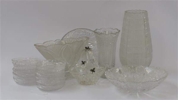 Lotto composto da due vasi portafiori, tre centrotavola, un vassoio tondo e dodici piattini in cristallo molato di diverso decoro (difetti)